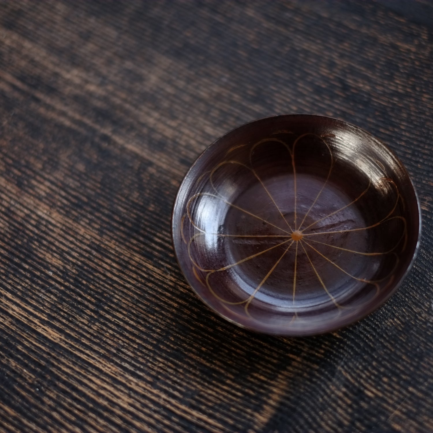 銀彩のような色味で描かれた小皿、十六花弁文様は