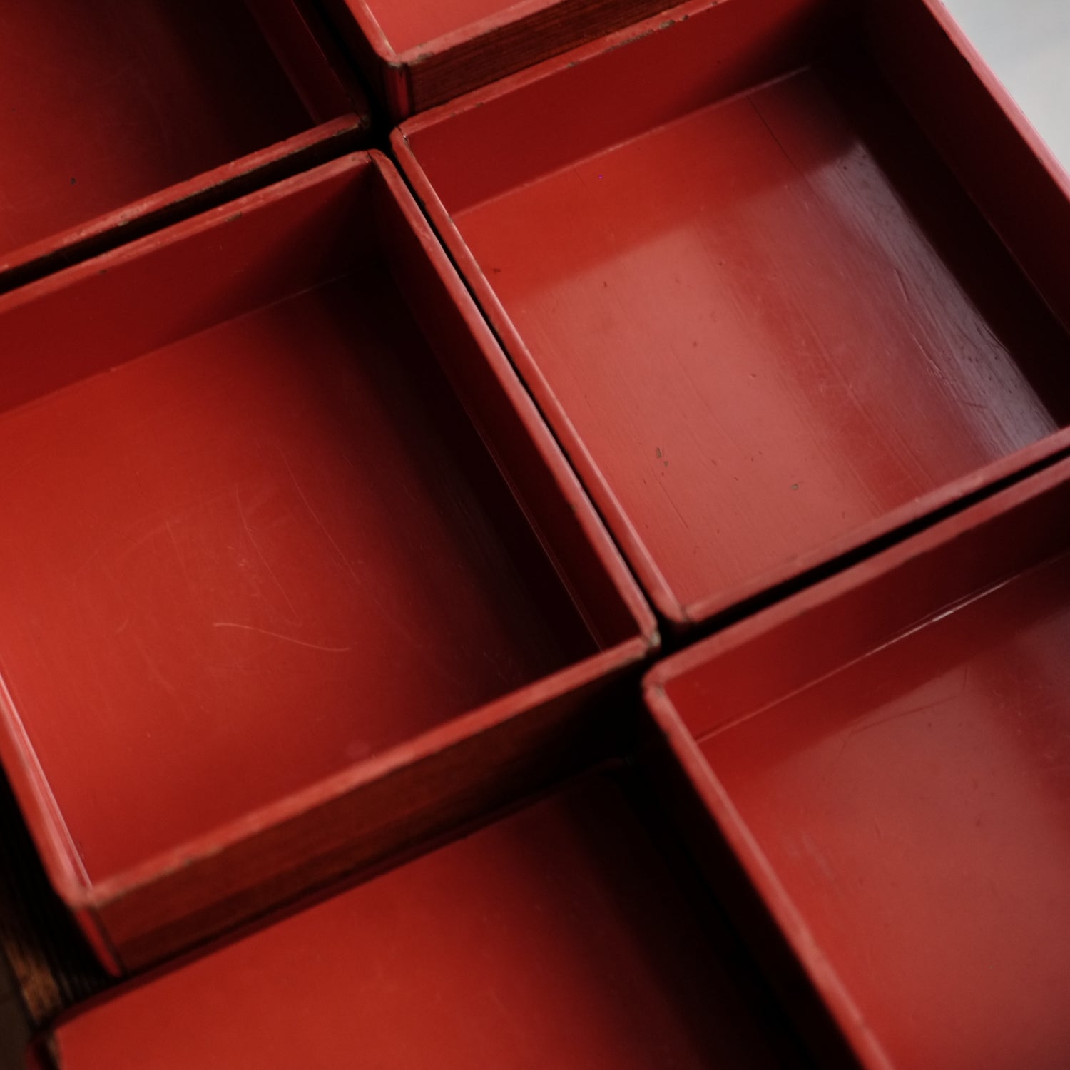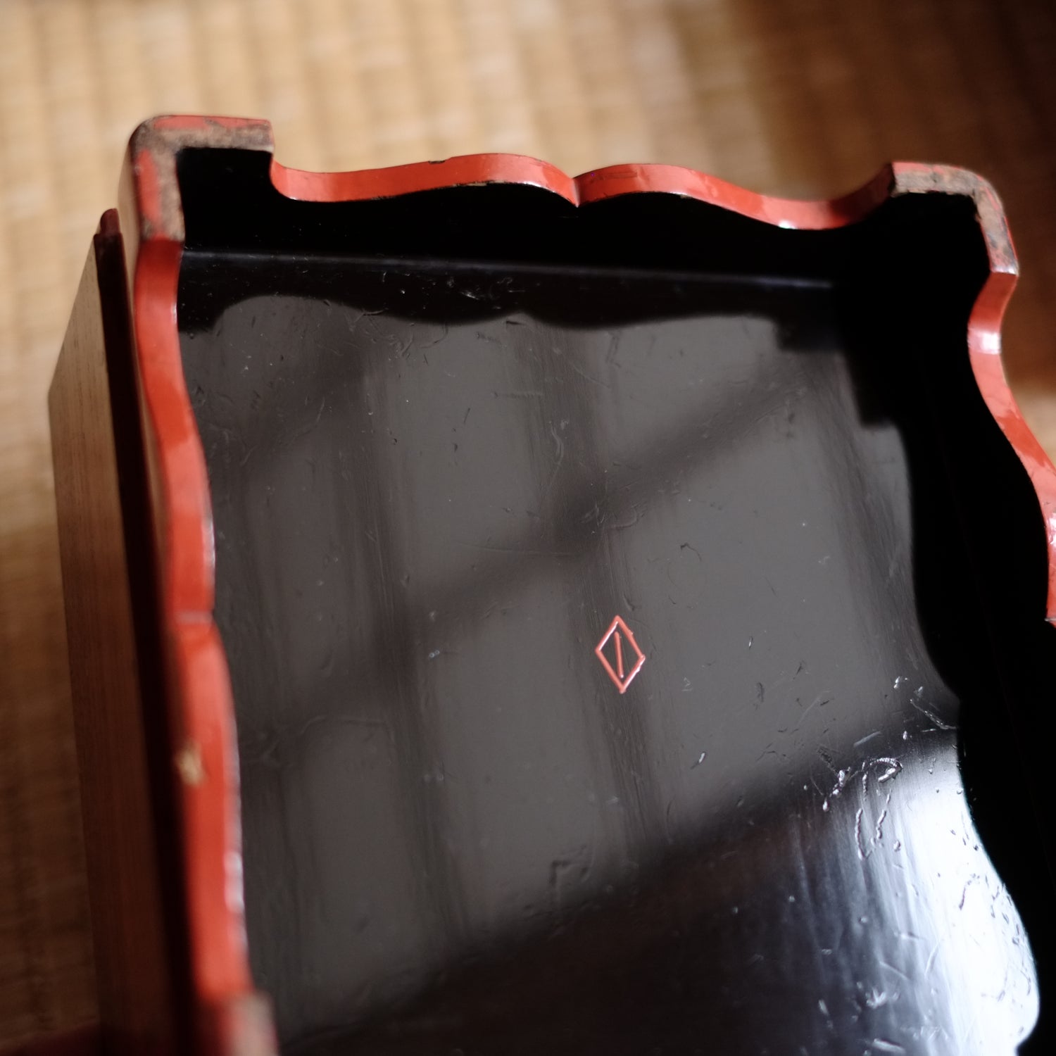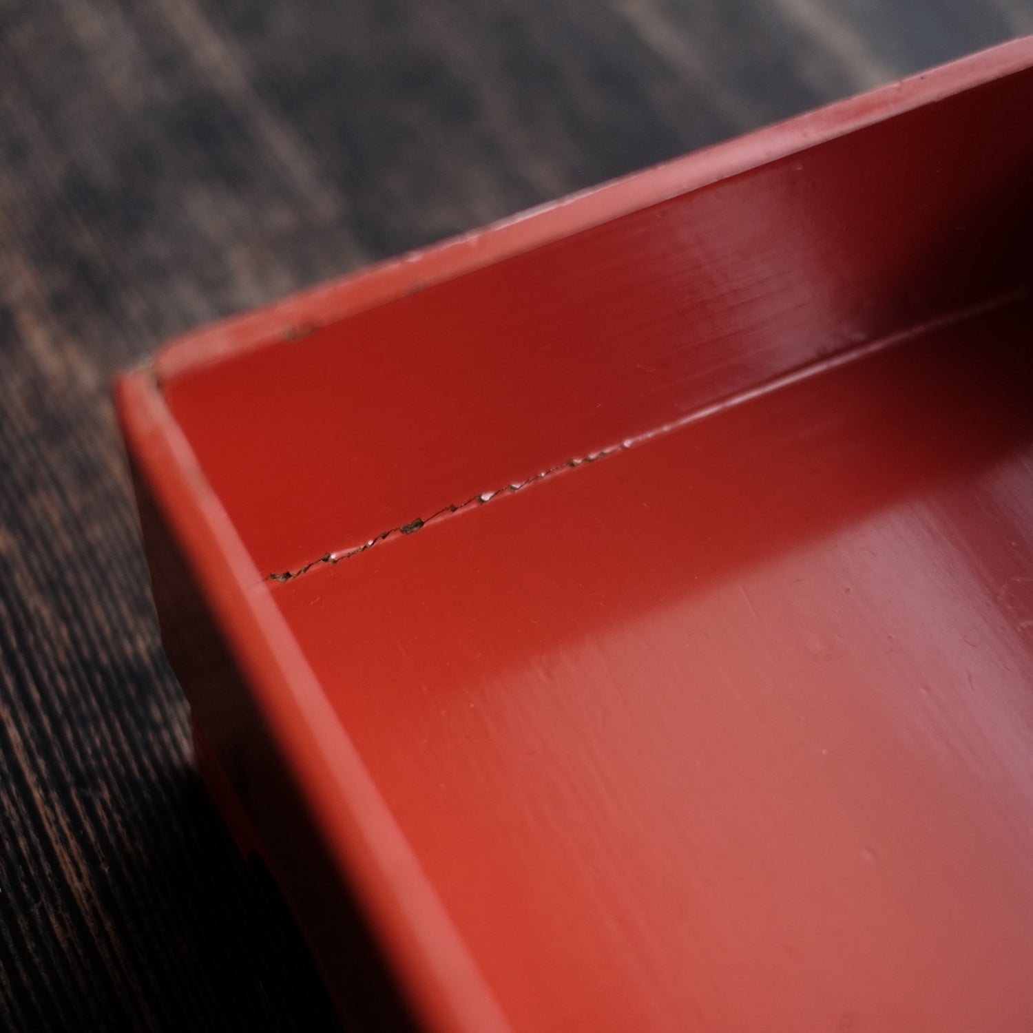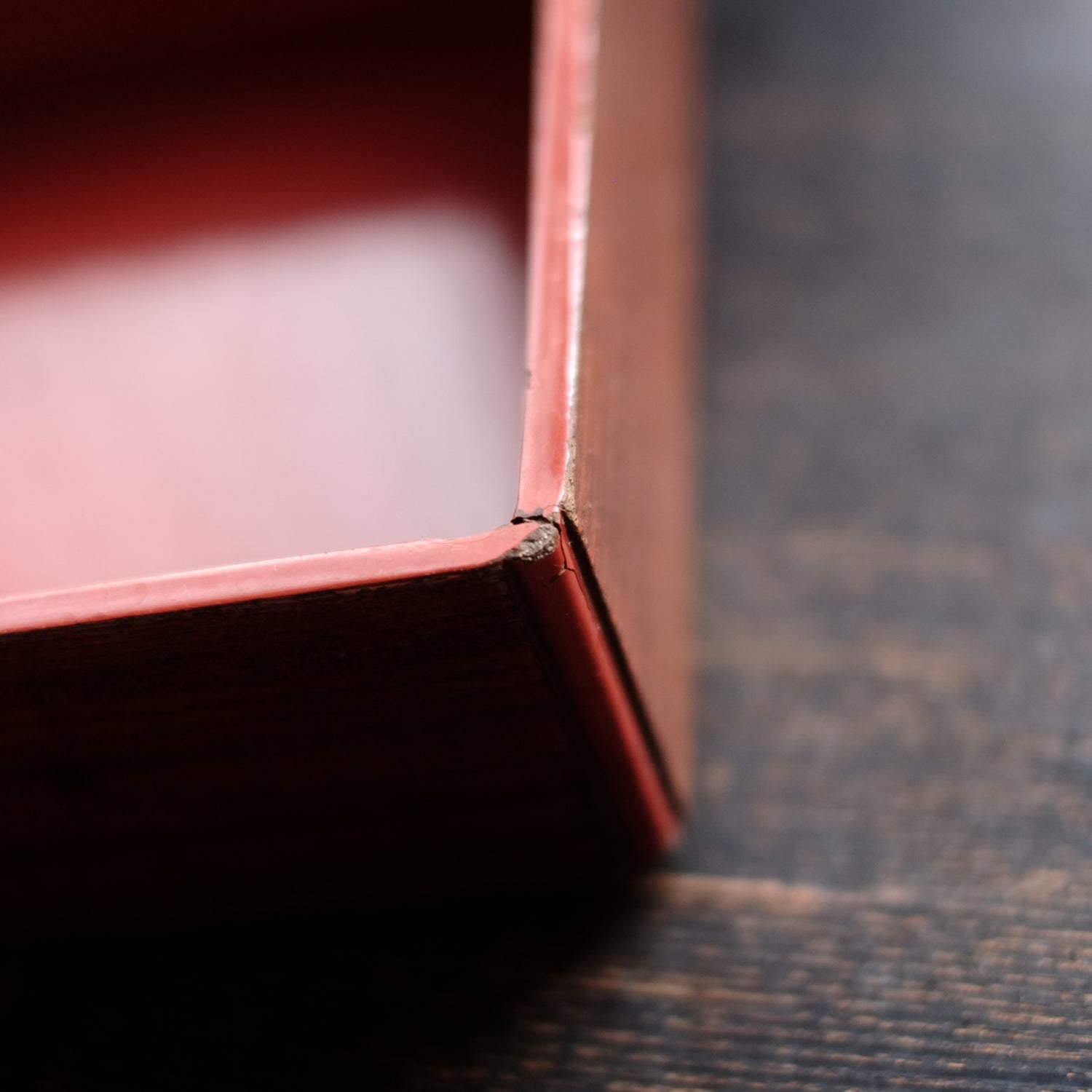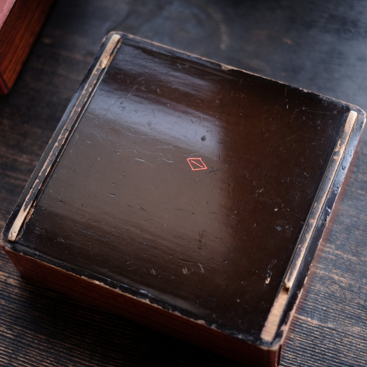 蓋に"縁朱漆塗り重箱明治〜"の記載が