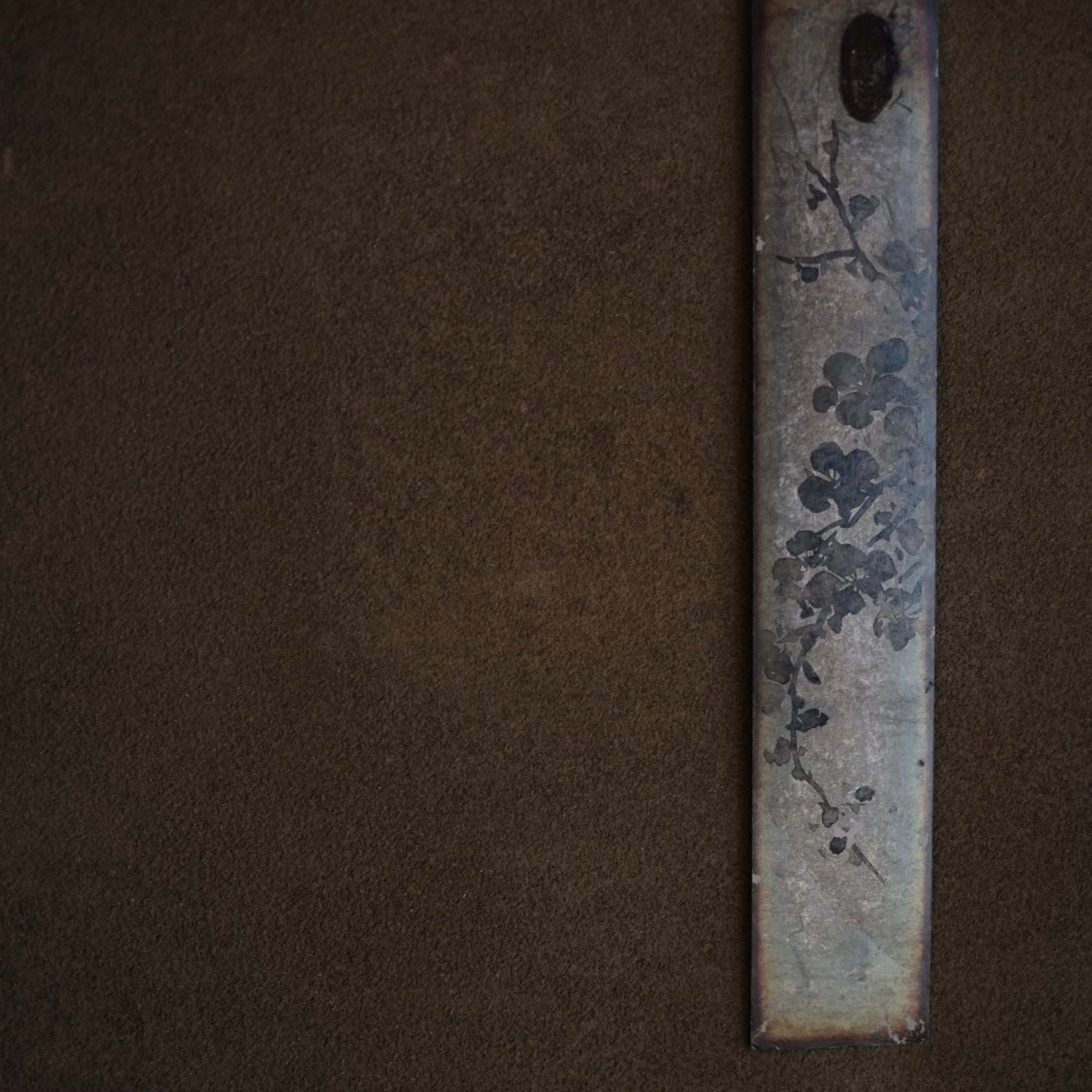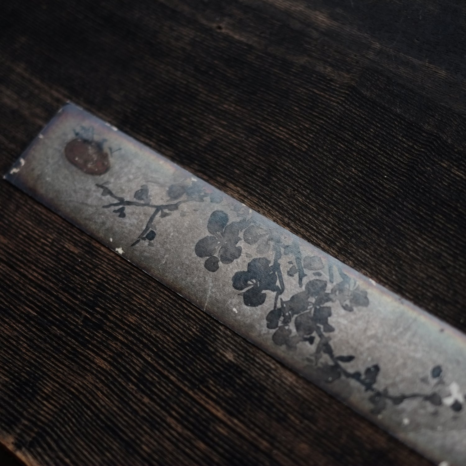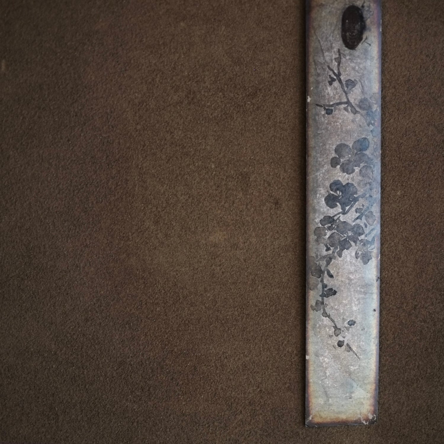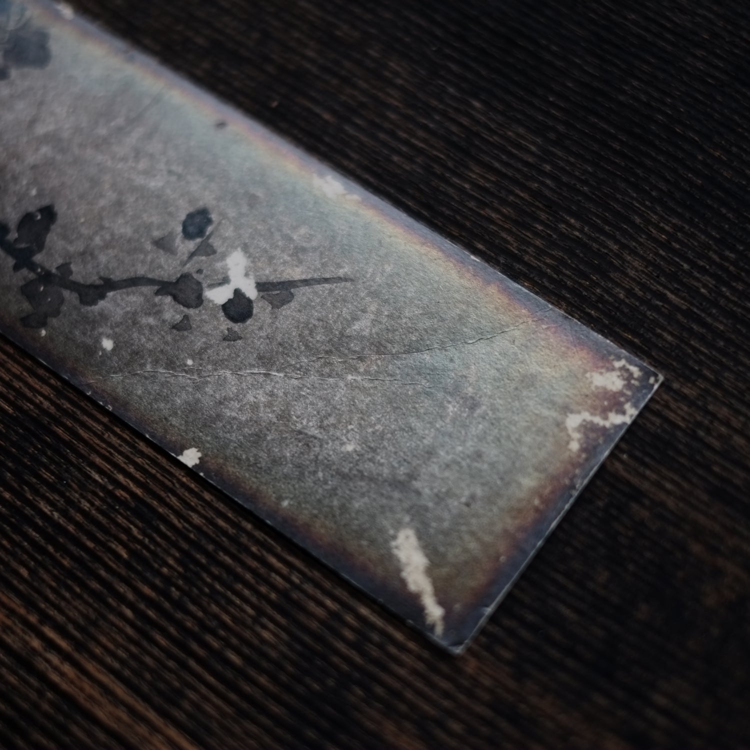 墨のみで描いた銀地紙本の梅図短冊一幅